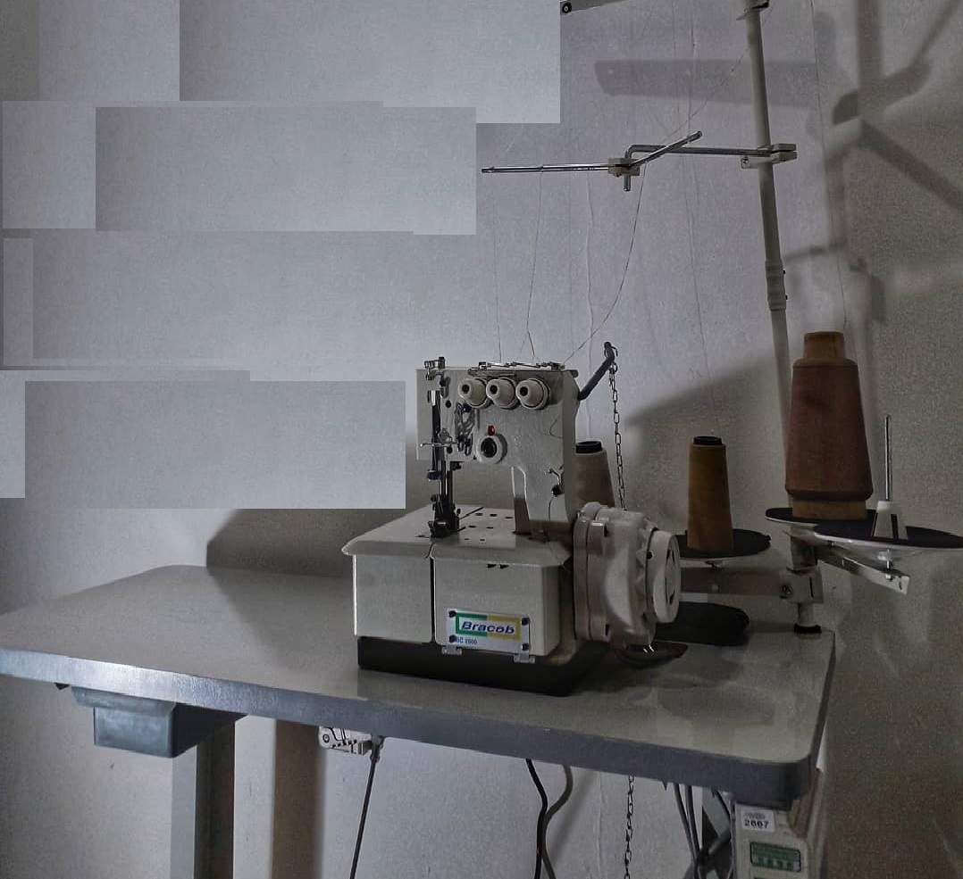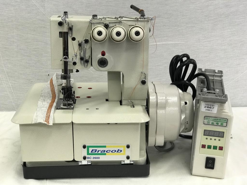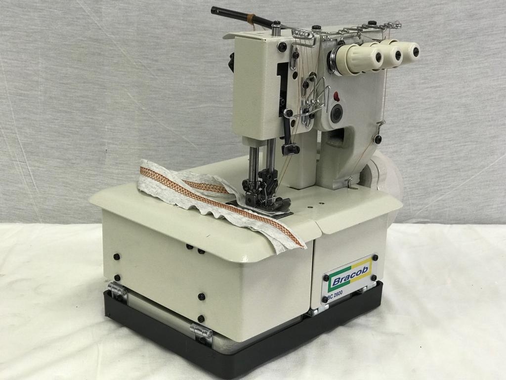.Máquina de costura tipo galoneira. Aplicação para bainha, debrum (colarete) e rebatimento de elástico.