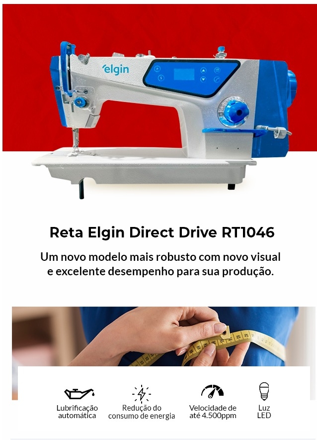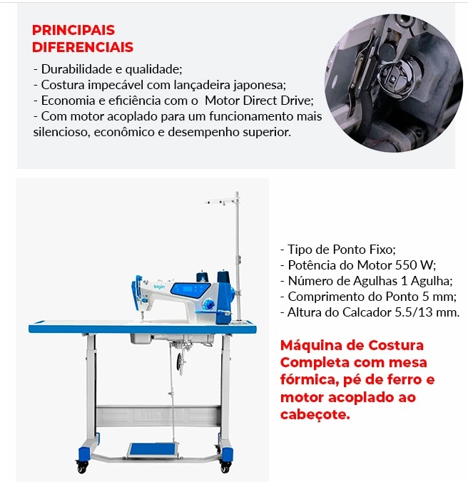 Motor Eletrônico Direct-Drive ligado diretamente ao eixo principal que proporciona maior agilidade na partida da máquina por não utilizar correia, além de proporcionar uma economia de 60 a 70% de energia em relação ao motor convencional.