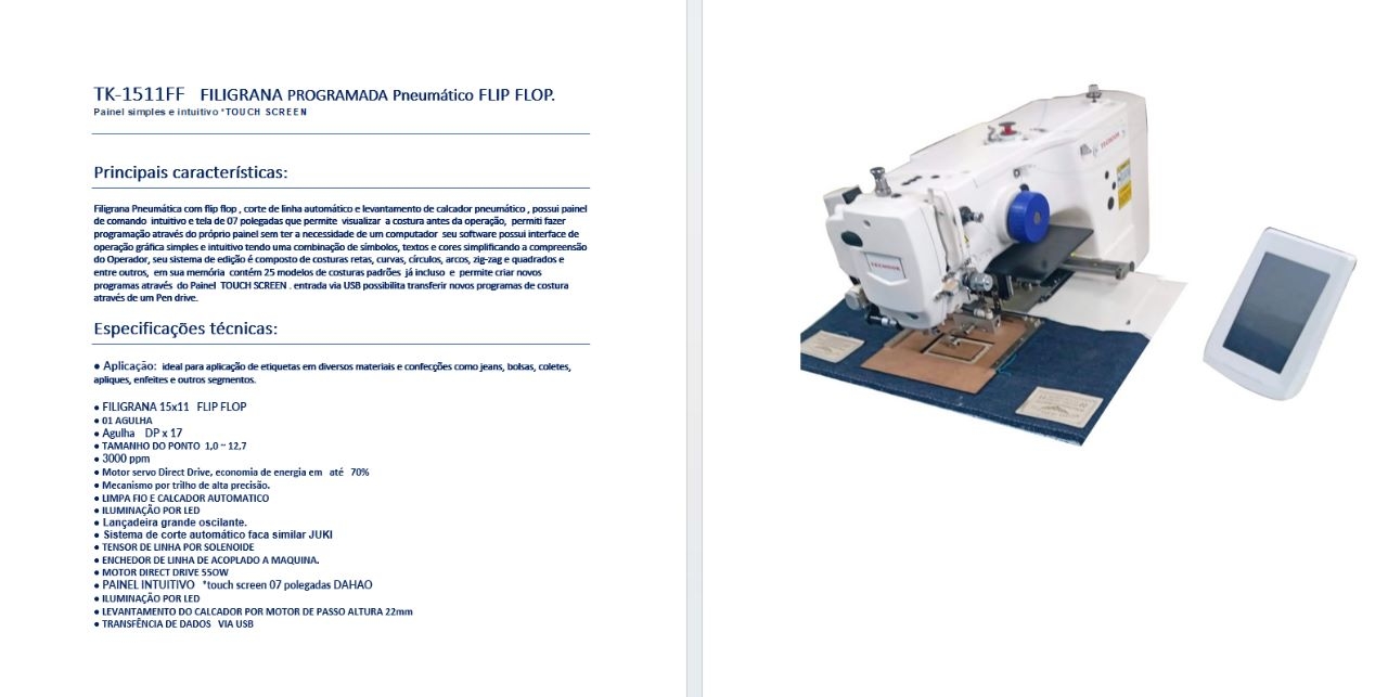 Filigrana Pneumática com flip flop , corte de linha automático e levantamento de calcador pneumático , possui painel de comando intuitivo e tela de 07 polegadas que permite visualizar a costura antes da operação, permiti fazer programação através do próprio painel sem ter a necessidade de um computador seu software possui interface de operação gráfica simples e intuitivo tendo uma combinação de símbolos, textos e cores simplificando a compreensão do Operador, seu sistema de edição é composto de costuras retas, curvas, círculos, arcos, zig-zag e quadrados e entre outros, em sua memória contém 25 modelos de costuras padrões já incluso e permite criar novos programas através do Painel TOUCH SCREEN . entrada via USB possibilita transferir novos programas de costura através de um Pen drive.