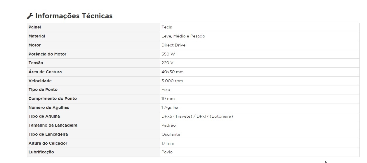 11 - Velocidade programável (a operadora ajusta a velocidade através de teclas no painel de comando) - as máquinas com motores convencionais são fabricadas para trabalhar na média de 5.000 RPM e para mudar a velocidade é necessária a troca da polia e reajuste da correia, o que demanda mais tempo.