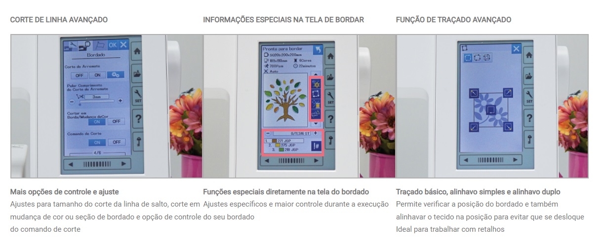 -Funções de edição do bordado na tela (duplicar, girar, alterar tamanho, alterar cores, criar layout de moldura e centralizar)
