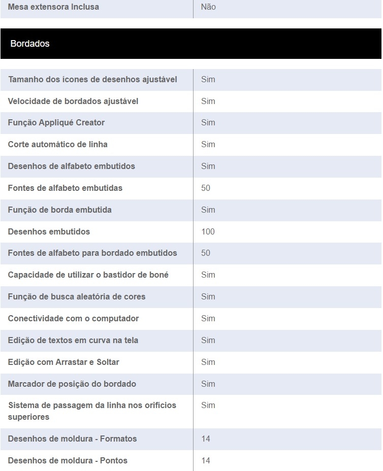 | Velocidade de bordados ajustável | Sim |