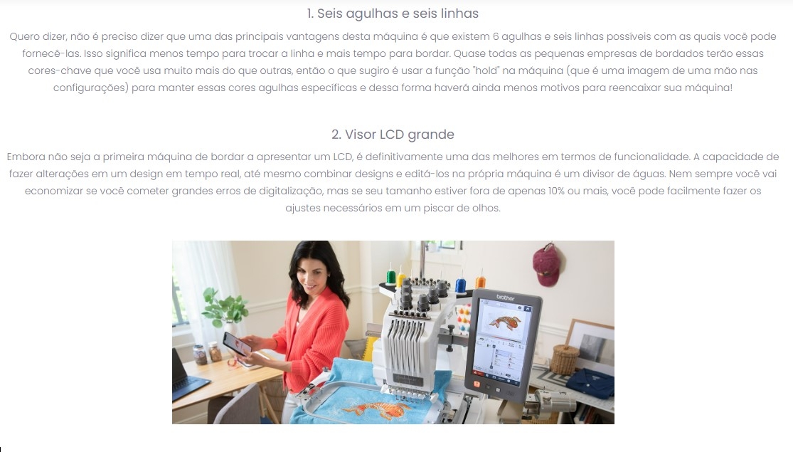 - Versatilidade de 6 agulhas: Cada agulha oferece configurações personalizáveis para velocidade, bloqueio de cor e agora o desengate do passador de linha - útil ao se usar uma agulha fina! Ao mesmo tempo, a ampliação do tamanho do Tensor da Linha cria uma ampla variedade de configurações de tensão, facilitando o bordado em tecidos mais rígidos com a tensão correta sem distorcer ou enrugar o tecido.