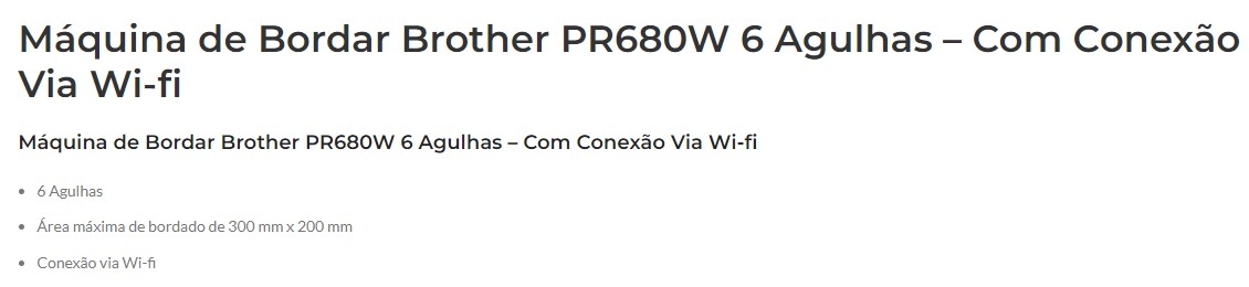 Você está pronto para levar sua paixão pelo bordado para o próximo nível? A nova e inovadora máquina de bordado multi agulhas PR680W da Brother está preparada para levá-lo(a) até lá. A velocidade das seis agulhas, conectividade WLAN e marcador laser em cruz, a PR680W pode trabalhar com uma ampla variedade de projetos e tecidos através de uma generosa área de bordado de 300mm x 200mm. Veja seus projetos na tela LCD de 10,1” de alta definição com ícones grandes e um menu de rolagem. Crie um projeto ou adicione um desenho a um toque utilizando os 350 designs de bordado integrados com as 50 fontes de letras.