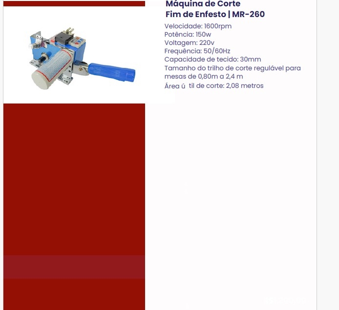 A máquina de Cortar Fim de Enfesto é capaz de cortar todos os tipos de tecidos: malha, algodão, jeans, seda, PVC, plástico, produto sintético em geral. Elimina materiais desperdiçados e economiza custos de produção. Além disso, é fácil de usar e eficiente. O equipamento possui um disco de 3½”, retorno semi-automático que acompanha um trilho de 2,60m e um suporte de rolo feito para desenrolar tecido sobre a mesa. As máquinas possuem um display analógico para contagem de peças cortadas.
