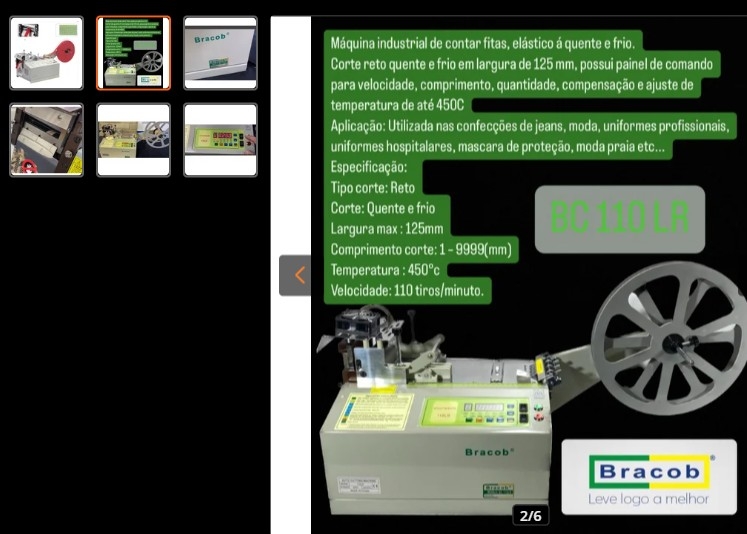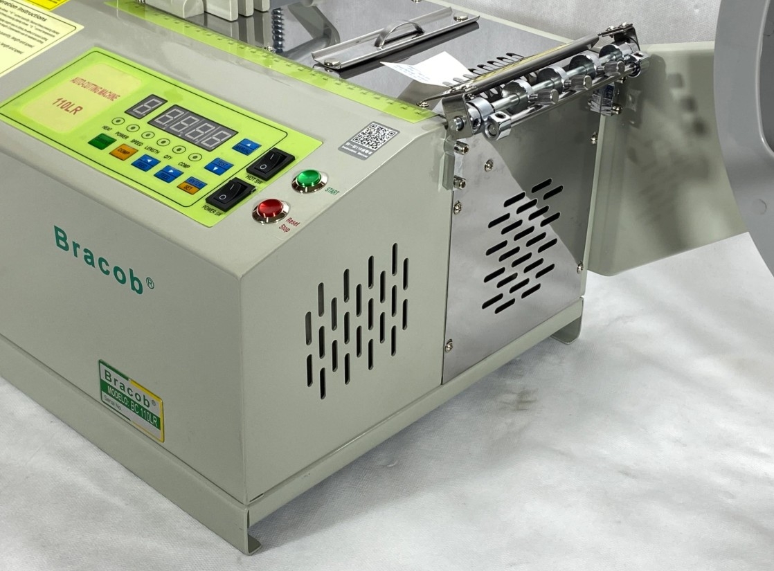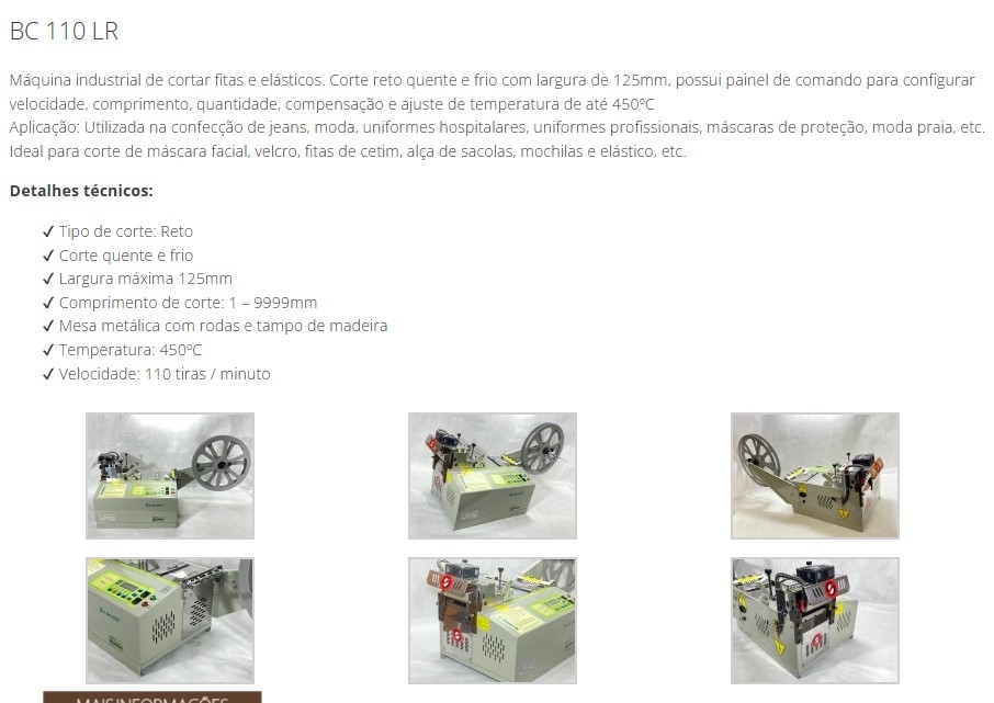 Máquina industrial de cortar fitas e elásticos. Corte reto quente e frio com largura de 125mm, possui painel de comando para configurar velocidade, comprimento, quantidade, compensação e ajuste de temperatura de até 450ºC