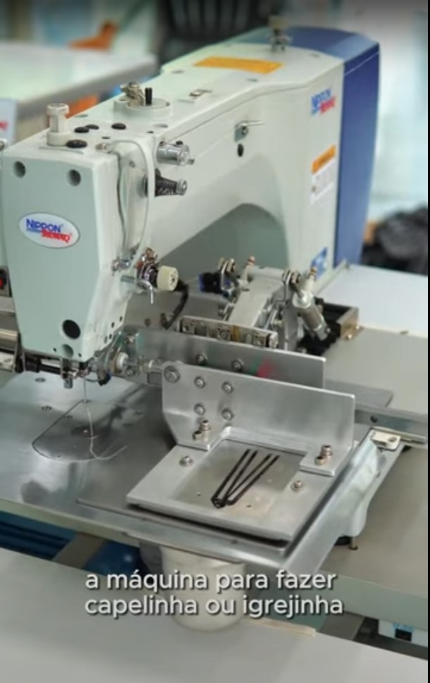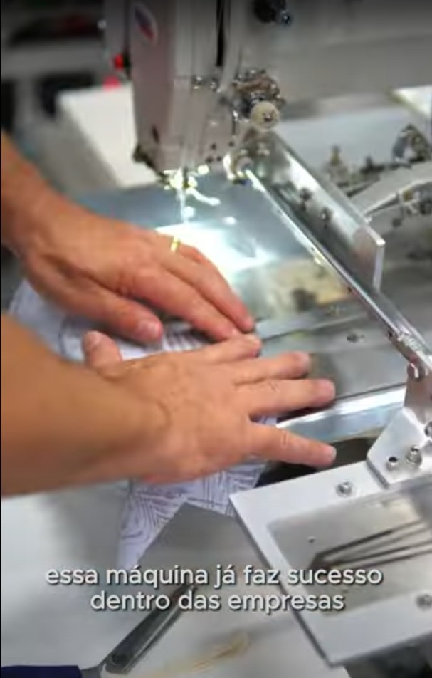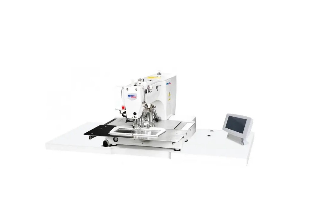Máquina de Costura Programável com diversas automações, indicada para padronização das costuras, otimizando a qualidade do acabamento e aumentando a produtividade se comparado com o processo manual