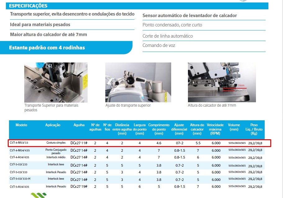 DE 4,0 MM, COMPRIMENTO DO PONTO ATE 4,6 MM, ELEVACAO DO CALCADOR ATE 5,5 MM, VELOCIDADE ATE 6000 PPM.