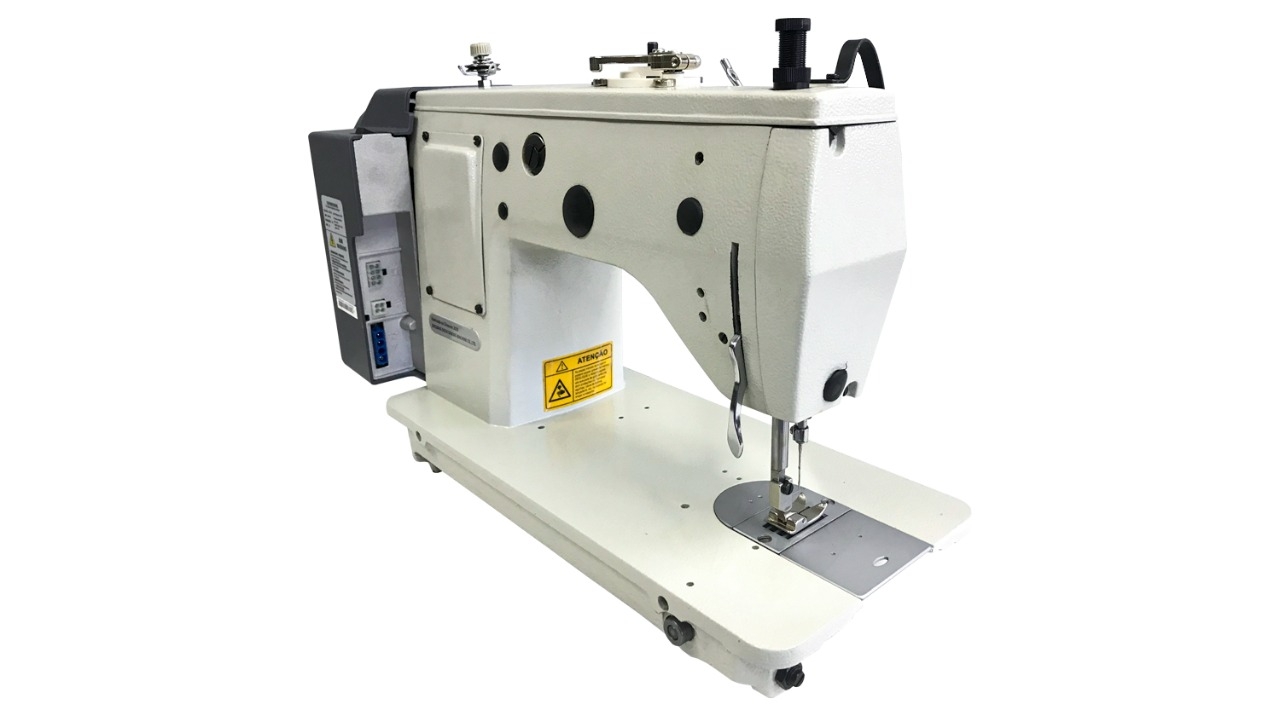 Máquina de costura industrial zigue-zague três pontinhos direct drive. Aplicação: aplicar elástico, aplicar viés, costura em lingerie.