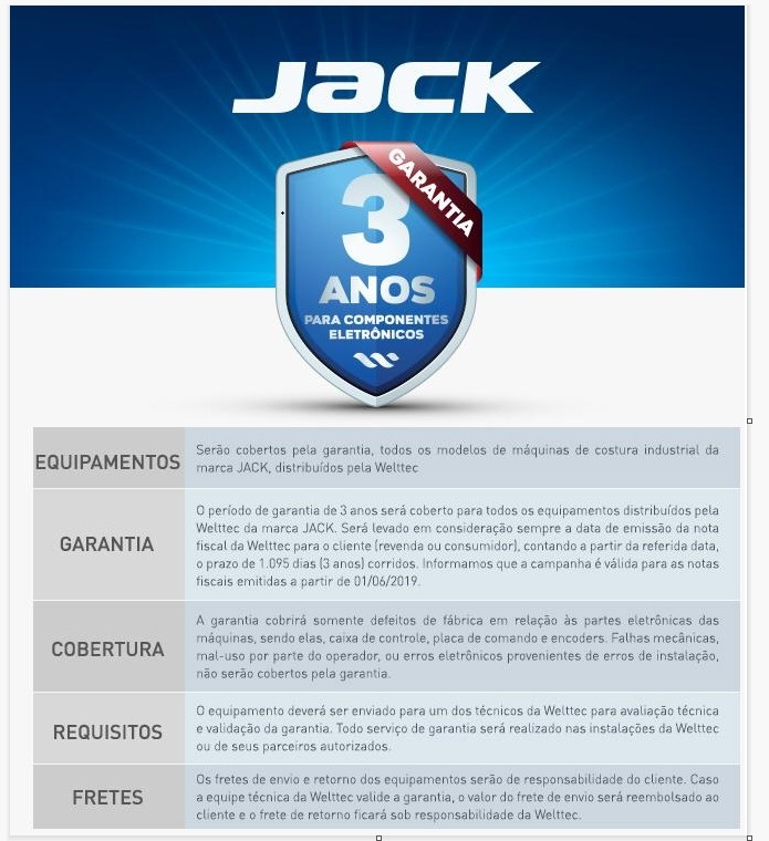 36 meses contra defeito de fabricação após a geração da Nota Fiscal em toda a parte eletrônica, direto pela JACK.