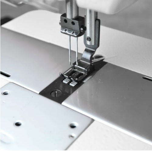 Pespontadeira de barra fixa de 2 agulhas com bitola de 6,4mm, com transporte duplo (dente e agulha) direct drive.