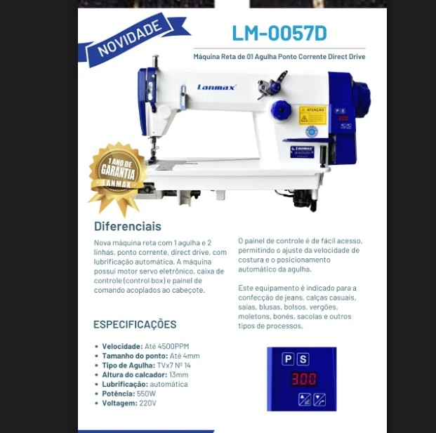 máquina reta com 1 agulha e 2 linhas, ponto corrente, direct drive, com lubrificação automática. A máquina possui motor servo eletrônico, caixa de controle (control box) e painel de comando acoplados ao cabeçote.
