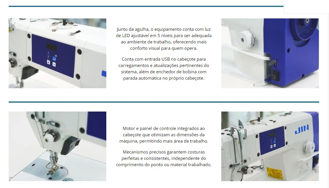 - Mecanismos precisos garantem costuras perfeitas e consistentes, independente do comprimento do ponto ou material trabalhado.