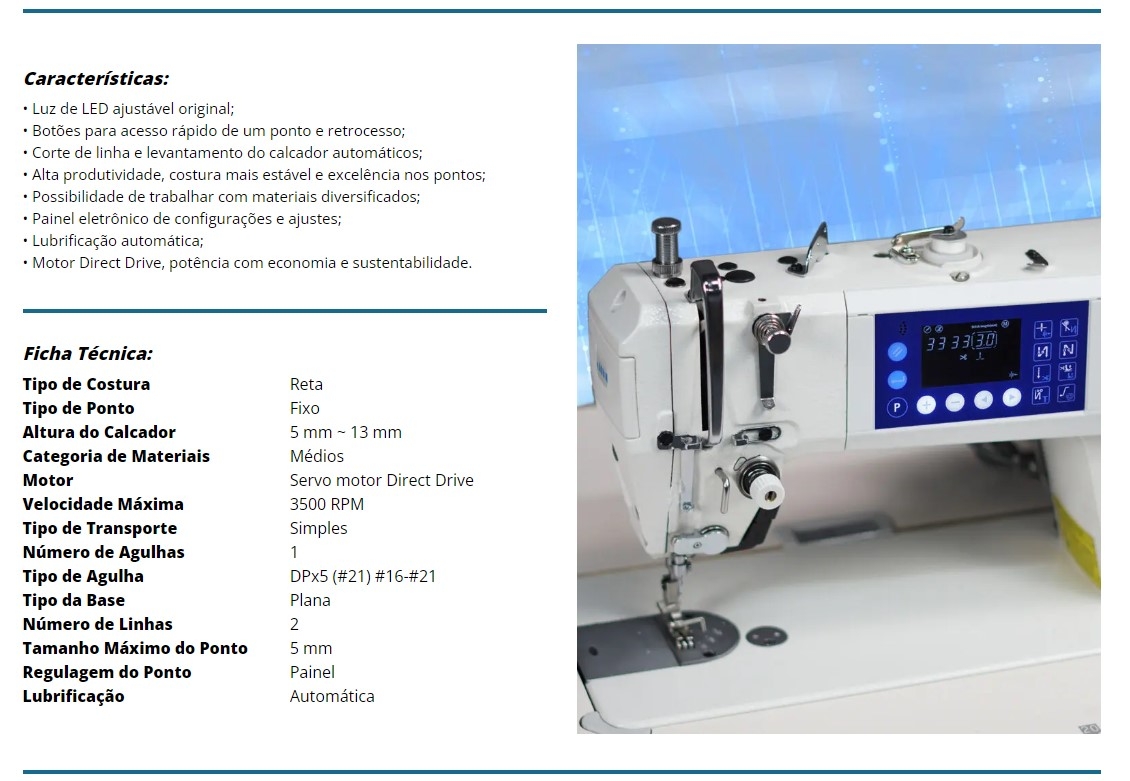 É equipada com porta de USB e painel LCD programável que permite ajuste do tamanho de pontos digital, além do sistema de retrocesso digital por motor de passo.