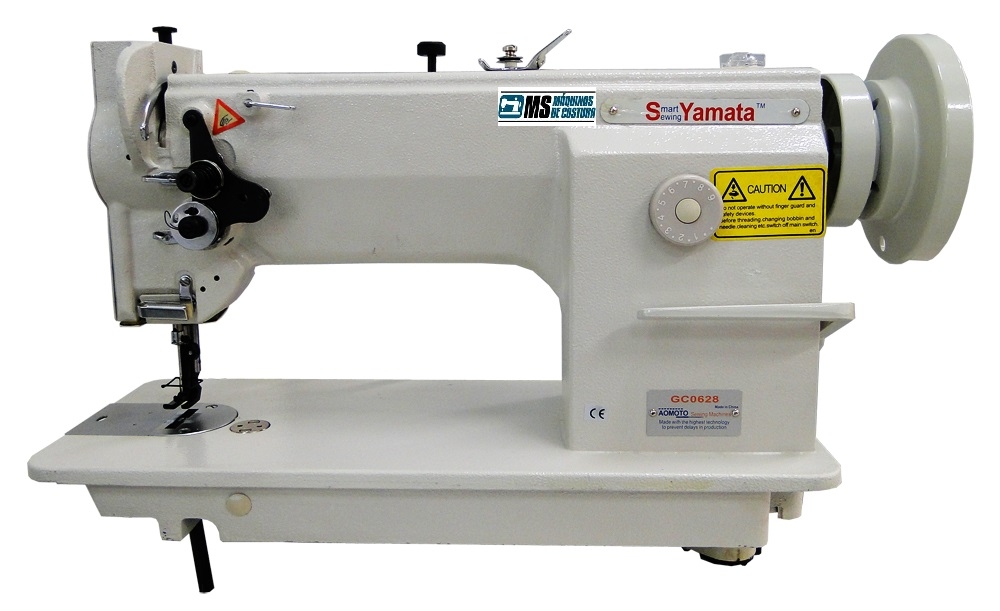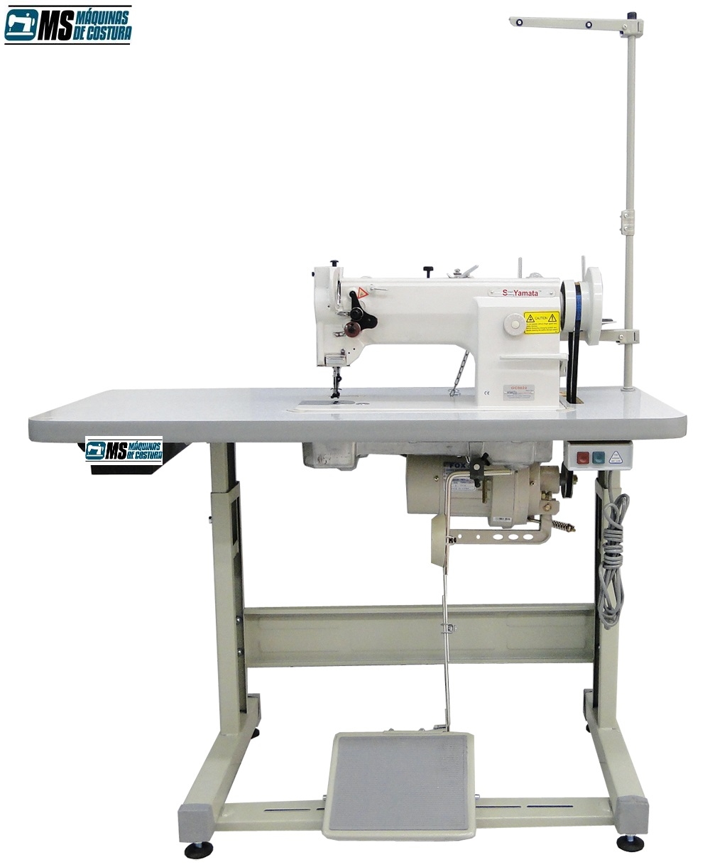 - Máquina de costura Industrial, Tipo Reta com transporte TRIPLO, Marca Yamata, Modêlo GC0628, 1 agulha, completa com conjunto de montagem composto por: tampo de madeira revestido em formica impermeável, estante de ferro pintado na côr cinza por imersão, motor 1/2hp 110/220v com chave de reversão de voltagem e velocidade e acessórios para manutenção.
