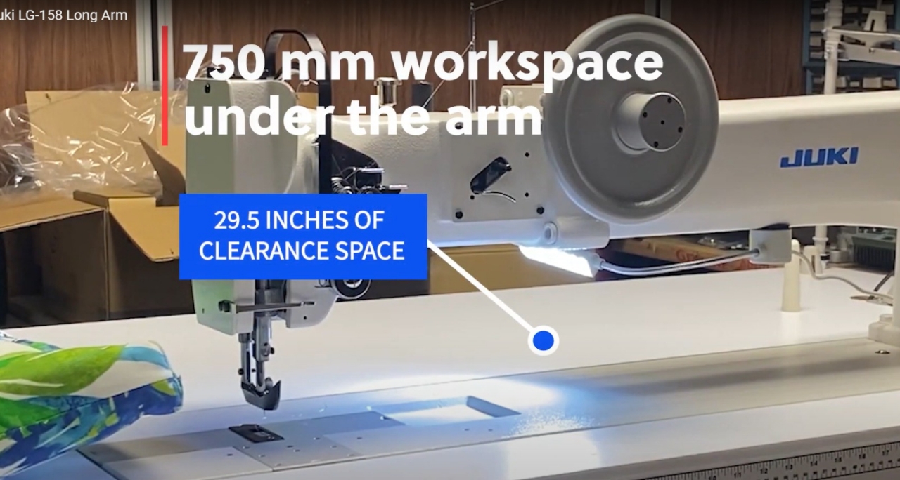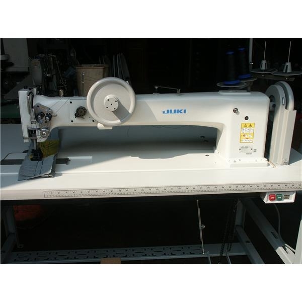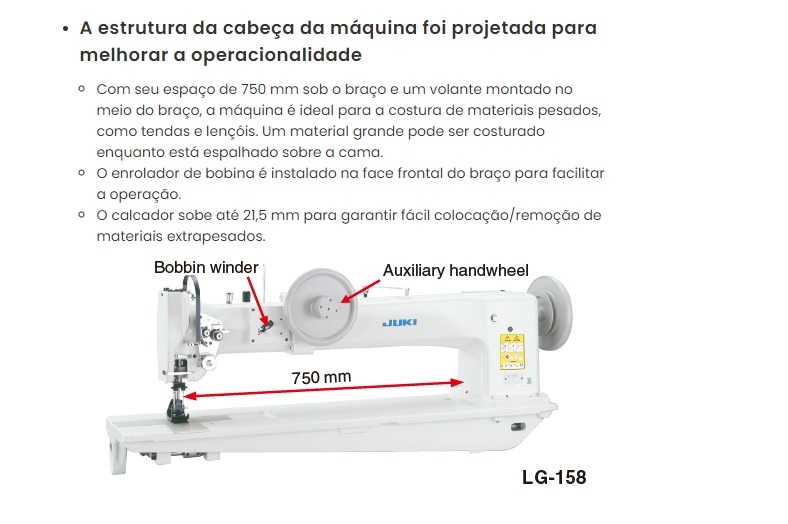 Esta JUKI LG-1581NU- é uma máquina de costura de braço longo de 30" com alimentação composta (pé ambulante), bobinas grandes e um calibre de agulha de 1/2".