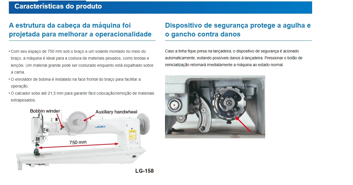 A Juki LG-158 é a maior máquina de braço longo que a Juki fabrica. Existem tantas opções disponíveis que o custo realmente depende do seu produto. Também pode ser o serviço mais pesado da linha Juki. Tem um ponto fixo de braço longo de avanço uníssono com eixo vertical, com um gancho grande. O corpo é um retrocesso aos estilos mais antigos. Não possui cortador de linha automático ou motor de acionamento direto interno. É mais simplista. No entanto, este é o modelo de maior qualidade que você pode obter se o tamanho for sua principal preocupação.