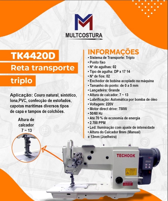 Máquina Reta 2 Agulhas com ponto fixo, lubrificação automática e transporte triplo por Dente calcador e agulha (evita o franzimento do tecido), indicada para materiais pesados como estofados, couros, lonas, sintéticos entre outros.