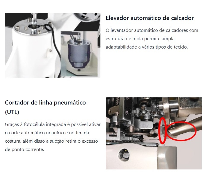 11 - Velocidade programável (a operadora ajusta a velocidade através de teclas no painel de comando) - as máquinas com motores convencionais são fabricadas para trabalhar na média de 5.000 RPM e para mudar a velocidade é necessária a troca da polia e reajuste da correia, o que demanda mais tempo.