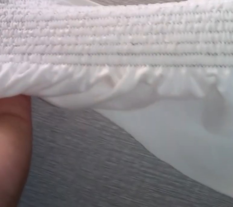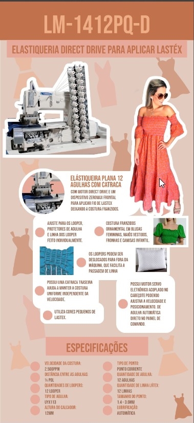 Elastiqueira plana de 12 agulhas com catraca, motor direct drive e um dispositivo zeromax frontal para aplicar fio de lastex para costurar franzidos ornamentais em blusas femininas, maiôs vestidos, fronhas e camisa infantil.