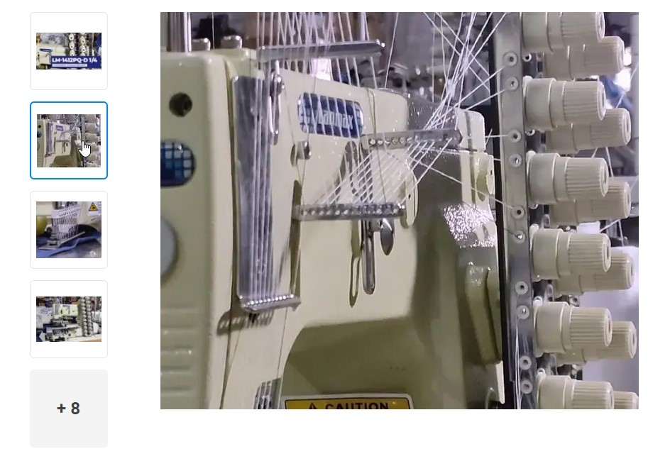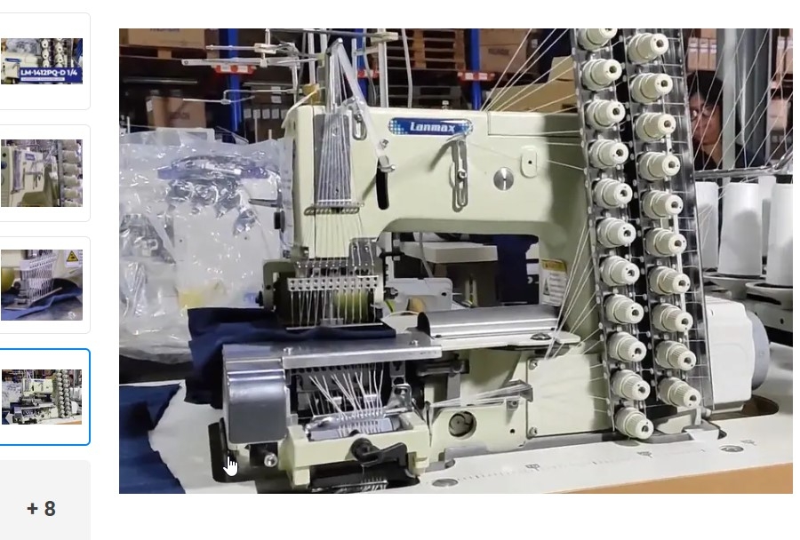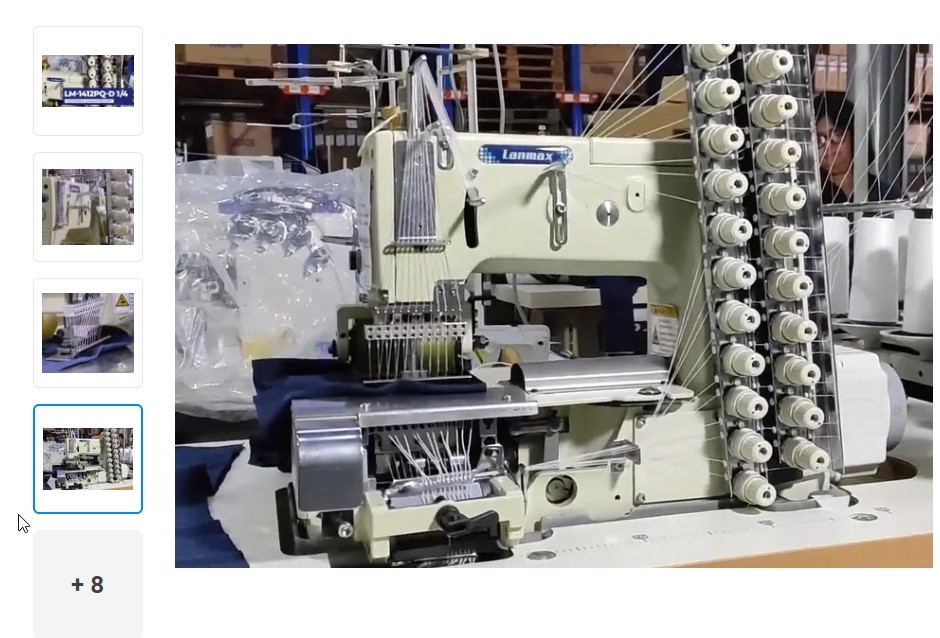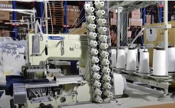 Elastiqueira plana de 12 agulhas com catraca, motor Direct Drive e dispositivo zeromax frontal para aplicar fio de lastex para costurar franzidos ornamentais em blusas femininas, maiôs vestidos, fronhas e camisa infantil.