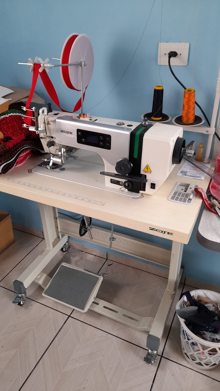 Máquina de costura com caixa de controle acoplado ao cabeçote da máquina.