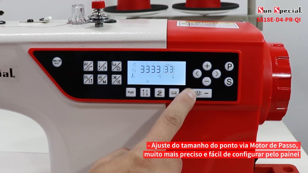 - Posicionamento automático de agulha auxiliando o operador, proporcionando o aumento da produção pois dispensa o manuseio manual do volante