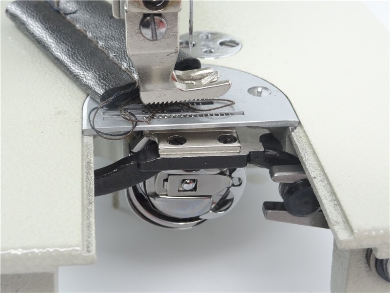 Máquina reta industrial com 1 agulha e ponto fixo. Possui lançadeira grande (Jumbo) e Transporte Duplo por dente e calcador, o qual otimiza o transporte de tecidos pesados.