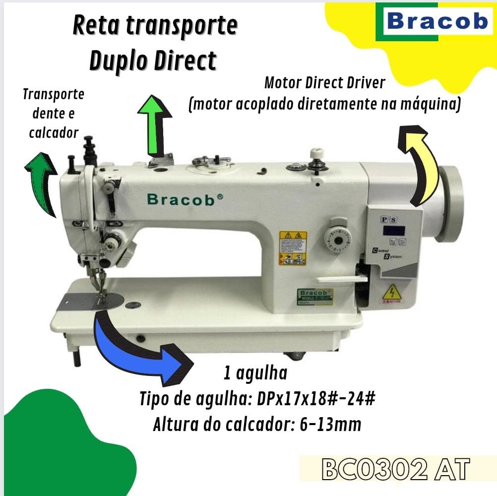 Máquina de costura industrial reta com transporte duplo (dente e calcador) direct drive. Aplicação para tecidos pesados (estofaria, jeans, etc).