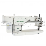 Reta industrial transporte duplo (dente e calcador) com motor servo eletrônico Direct Drive. Possui lançadeira grande e ponto de 8mm, posicionador de agulha em cima e/ou embaixo, led de iluminação e controle digital de velocidade. Indicada para materiais como; couro natural ou sintético, lona e PVC. Pode ser usada na confecção de calçados, jaquetas, estofados, cintos, carteiras, bolsas e outros artigos de couro.