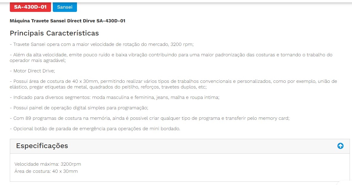 - Possui área de costura de 40 x 30mm, permitindo realizar vários tipos de trabalhos convencionais e personalizados, como por exemplo, união de elástico, pregar etiquetas de metal, quadrados do peitilho, reforços, travetes duplos, etc;