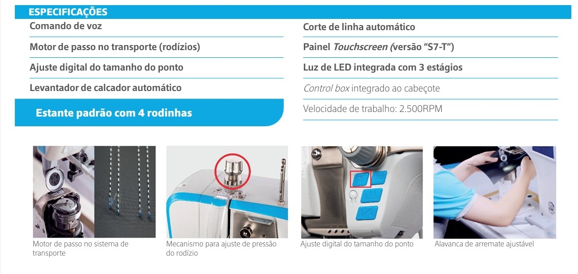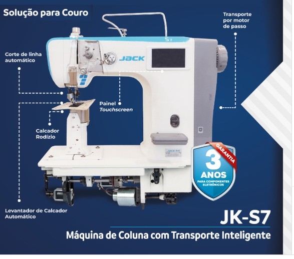 A Máquina de Costura de Coluna Jack S7 é a escolha ideal para quem busca produtividade e eficiência, combinando design moderno com tecnologia de ponta. Com sistema de corte curto, motor de passo no transporte principal e no rodízio, ela garante uma costura precisa e de alta qualidade.