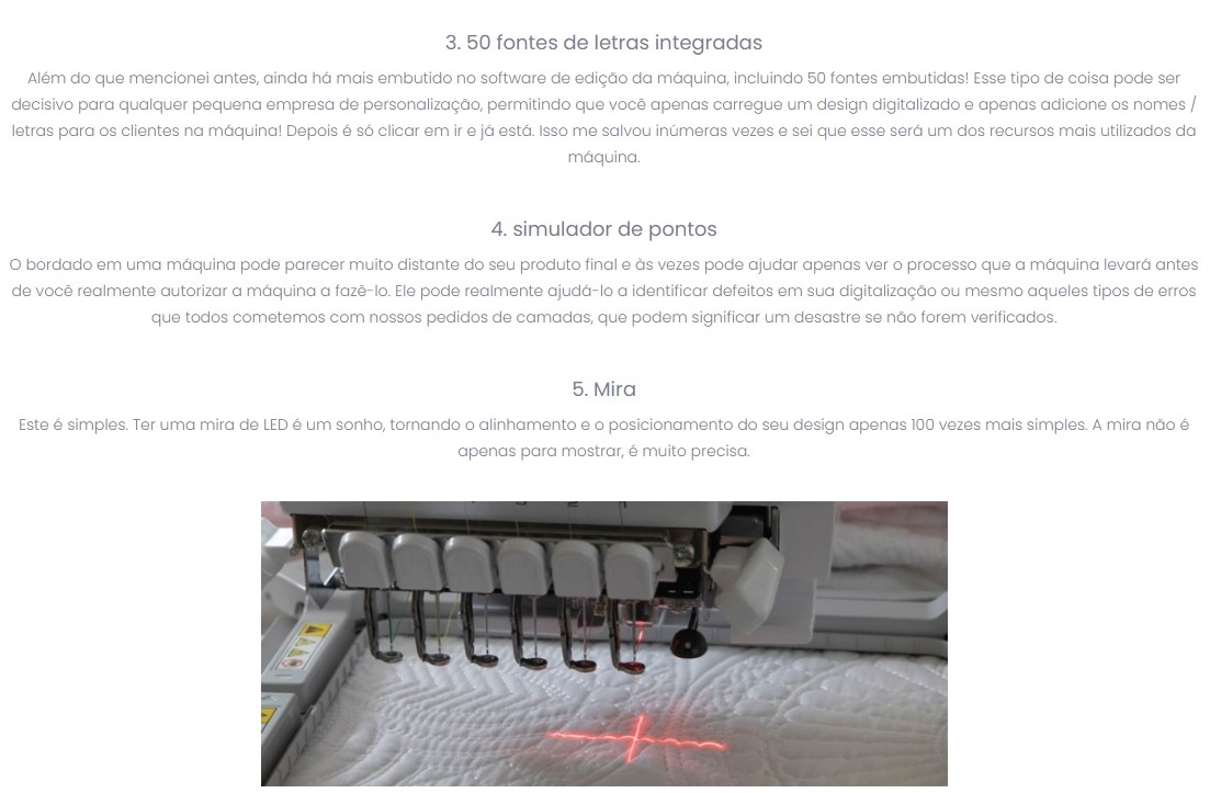 - Marcador Laser para Bordados: Obtenha um posicionamento preciso e confiável, além de iluminar seu tecido para ver onde a agulha passará para todos os seus projetos com o Marcador Laser em cruz. Precisão de +/- 0,5 mm de passagem da agulha com materiais de até 1 mm de espessura. A nova mira a laser tem um eixo horizontal mais longo, o que a torna extremamente precisa para posicionamento – mesmo quando você fixar o tecido torto no bastidor.