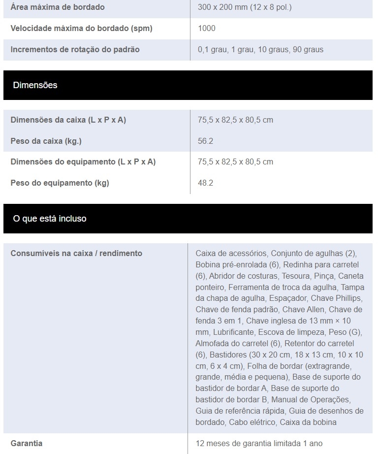 | Área máxima de bordado | 300 x 200 mm (12 x 8 pol.) |