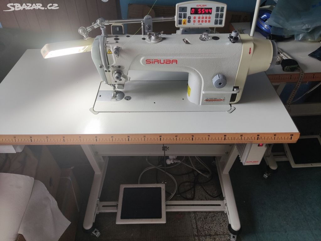 Máquina de ponto reto de alimentação dupla de agulha única SIRUBA para tecidos finos e médios com cortador de linha. Completo com servo motor no volante e bancada industrial.