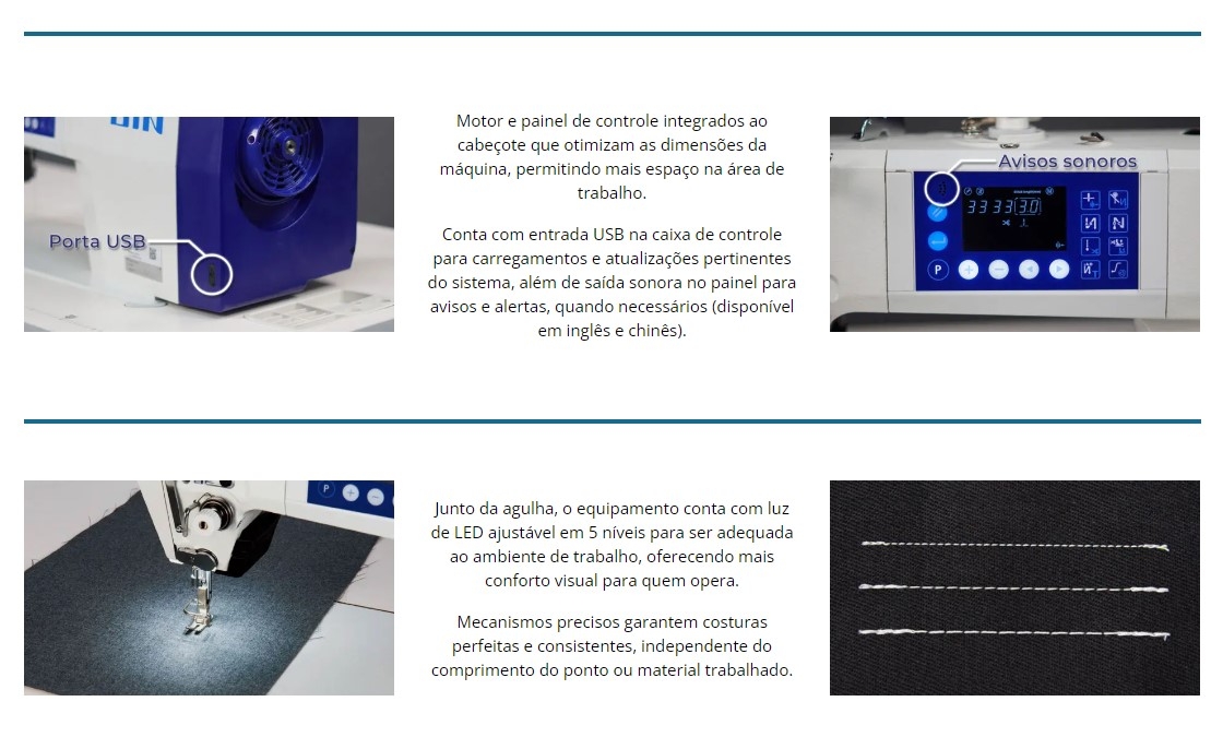 Junto da agulha, o equipamento conta com luz de LED ajustável em 5 níveis para ser adequada ao ambiente de trabalho, oferecendo mais conforto visual para quem opera.